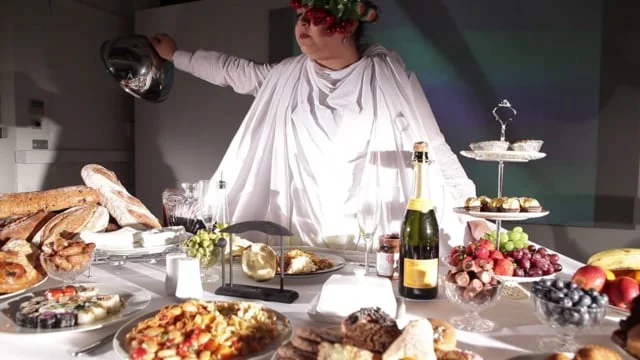 Film-still of performance. Performance consisted of a spoken-word poem delivered whilst attempting to consume as much food as possible from the banquet installation. Live-feed of the artist’s mouth was projected behind. Watch video documentation of the full performance below.