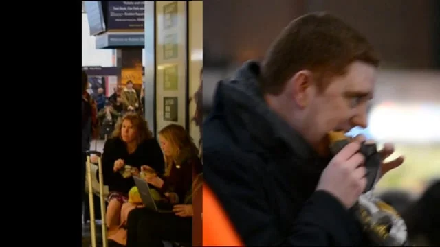 Split-screen video documenting an hour at London Euston train station. A collection and digital-collage of footage of people in transit. The split-screen mimics their entries and exits, reflecting the unique rhythms, flows and timings of peoples’ unique schedules, like well-rehearsed dance routines. The act of capturing people eating albeit voyeuristic and violent intervention, is a device aimed at mirroring the panoramic recording by CCTV cameras, in public spaces. The act of eating itself is a seemingly innocuous and mundane ritual that everyone must transact – a grounding mechanism, if you like. Yet it raises many questions, amongst which: whether the act of eating is a social or solo one? A private or public act?